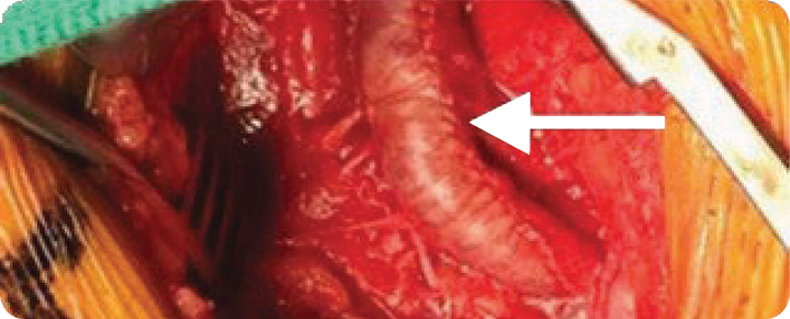 At 16 months, the VasCure patch (arrow) in the right CFA was fully incorporated into native vascular tissue, indistinguishable from the surrounding artery. Due to disease at an adjacent site, a second VasCure patch was used to extend the repair.