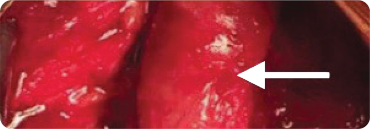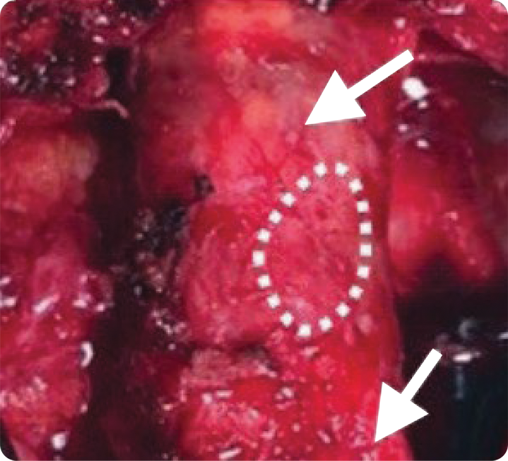 Twenty months post-index procedure, a third surgery was performed for bypass. Both previously placed VasCure patches (arrows) appeared fully incorporated into the native femoral artery. The dashed line indicates the patch-to-artery anastomosis for histology.